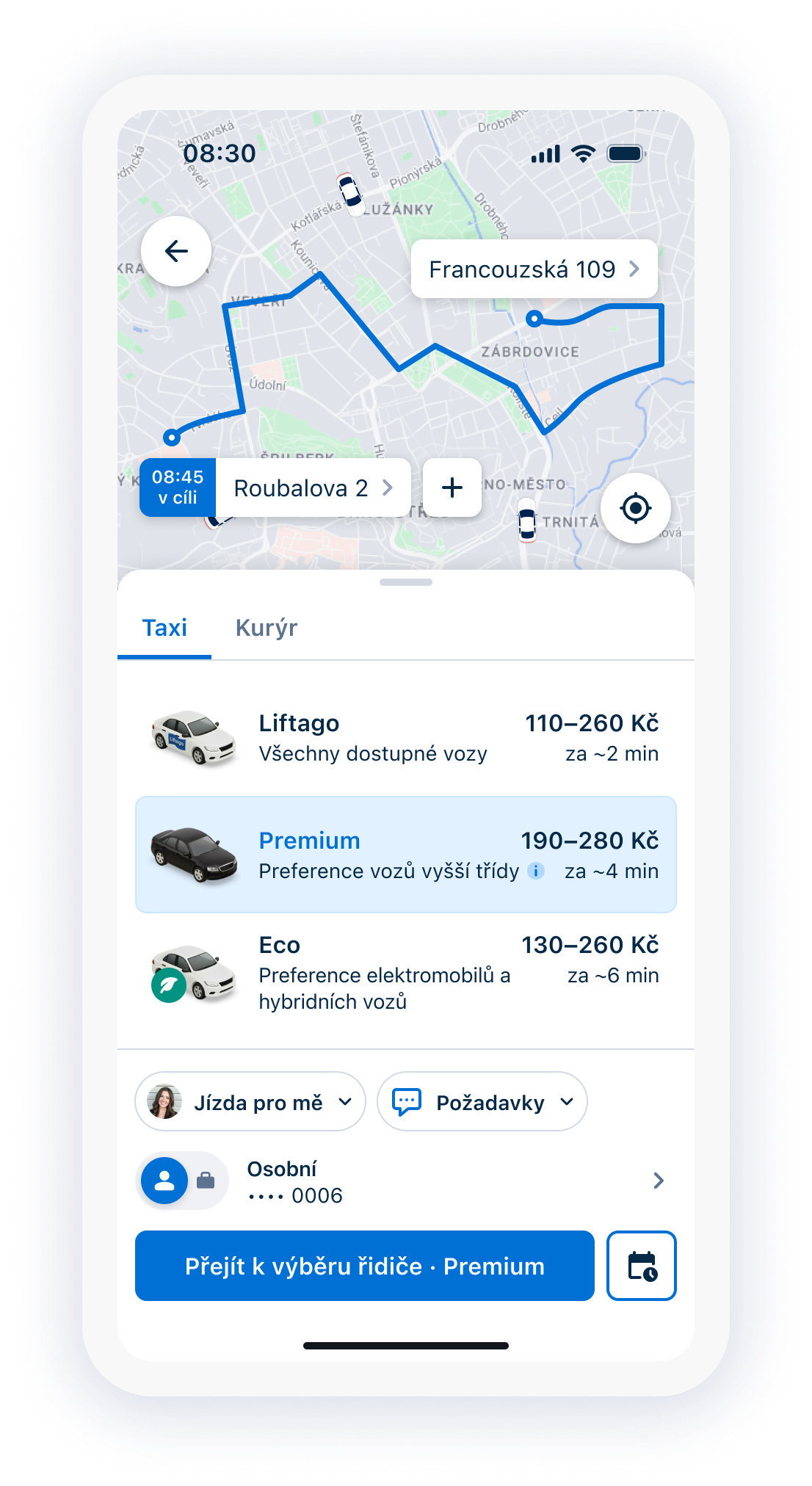 Liftago allows drivers to determine their own fares. In the app, available drivers’ offers are displayed with price, estimated arrival, rating, and vehicle type, so you can pick the one that fits you best. On the web interface, you can choose according to vehicle type.